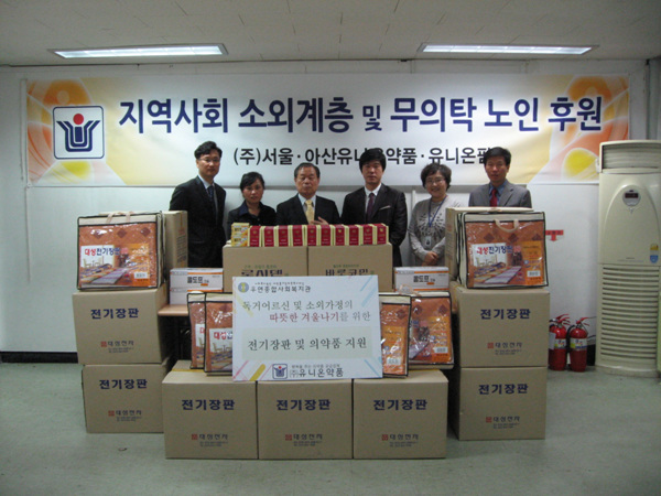 위치한 우면종합사회복지관에 의약품및겨울철난방용 전기장판등 1500만원상당의 물품을 전달 하였습니다. 유니온그룹 안병광 회장님께서는 매년 회사 지역구인